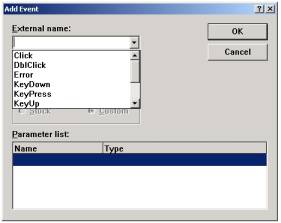 在资源视图中用鼠标右键点击放置于对话框上的ActiveX控件,并从弹出菜单中选择"Events…"菜单项,将弹出如图15所示的对话框,在左边的列表框中显示了控件提供的事件,双击事件将在包容器程序中添加相应的事件处理函数和事件映射表,并可以在响应控件发出的事件后进行相应的处理: