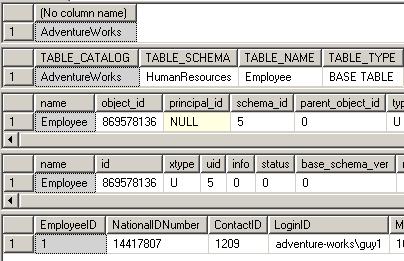 通过查看输出结果,我们可以看到,正如执行SQL Server 2000语句一样,DB_NAME()在AdventureWork数据库上下文环境下运行,以此从系统对象中找回员工表的元数据。然而,相同意义的INFORMATION_SCHEMA 和SQL Server 2005语句不能利用这个方法,并且员工表的查询彻底失败。这种方法行不通,是因为实际上这两个语句在主数据库上下文环境下执行。当在主数据库中找到这个存储过程时,把当前数据库上下文环境应用到SQL Server 2005具体目录信息是不明智的。