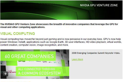 NVIDIA同时还开启了一个新网站GPU Venture Zone,作为其合作伙伴创新GPU应用的公开展示区。