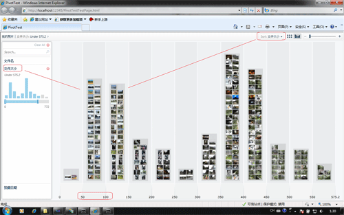 上面的代码中,22行到34行就是将文件系统中的图片添加到CXML文件的方法了。25行到33行在CXML添加具体的元素,例如25行设置了PivotViewer显示图片时,图片的名称,而28行就是将图片本身添加到PivotViewer控件中,PivotServerTools自己会生成Deep Zoom Compositor理解的格式,并且帮我们生成对应的.dzi和.dzc文件。29行到32行,分别是添加了图片不同的信息,PivotViewer可以根据这4个种类分类图片,如下图所示: