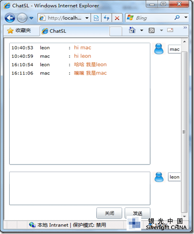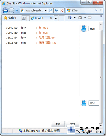新建一个SL文件,Chat.xaml代码,包括了一个发送消息窗口和一个显示聊天信息的窗口,这个聊天的窗口从普通HTML街面上接收两个参数,即user和partner互为聊天对象。