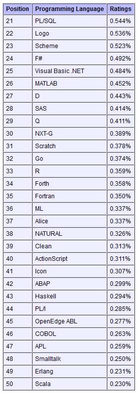 前三甲依然是Java、C、C++,4至10名依次为C#、PHP、Objective-C、Visual Basic、Python、Perl、JavaScript。从下图的榜单中可以看出Objective-C和Lua借苹果之势,使用的人也越来越多了。