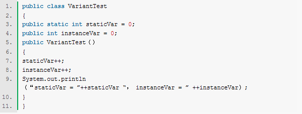 例如,对于下面的程序,无论创建多少个实例对象,永远都只分 配了一个staticVar变量,并且每创建一个实例对象,这个staticVar 就会加1;但是,每创建一个实例对象,就会分配一个instanceVar,即可能分配多个instanceVar,并且每个instanceVar的值 都只自加了1次。