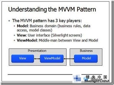 MVVM会定义三部分,包括Model、View和ViewModel,下图中展示图片是来自我们silverlight课程中的幻灯片,以一种简明的方式总结了MVVM模式中各个部分。