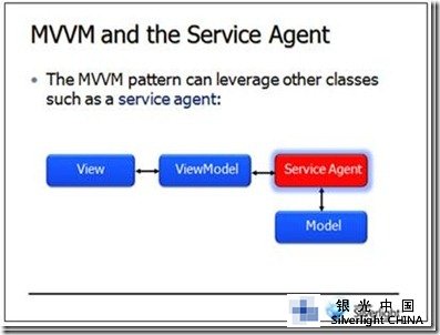 附件的成员可能会被添加到Model-View-ViewModel中以实现进一步的隔离,例如,我通常会创建一service agent类,service agent初始化服务调用、捕获已返回的数据、发送数据到ViewModel。这样,ViewModel就把聚合数据的职责委托给了service agent。此service agent可以根据需要在多个ViewModel中重用。下图是展示的把service agent集成到MVVM模式中。