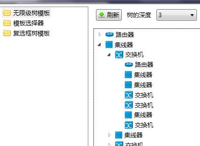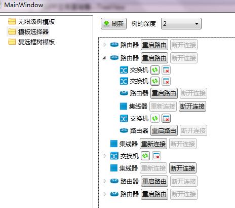 案例二, 主要给大家讲解的是,如何采用DataTmeplateSelector通过重写SelectTemplate方法来实现的。来控制显示样式、右键菜单等 功能。这里主要讲的是,不同服务器之间显示不一样,而且连快捷菜单也对应不一样。这里有个特别说明的是:因为功能显示的需求,这里把集线器定义为没有子设 备的模板。还有另外一个功能就是当我按下重启的时候,断开按钮就不能使用。这里用到的是Command。园里前辈们写了很多这方面的文章,我这里就不对 ICommand进行详细讨论。