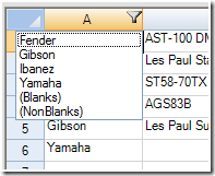 列首显示了一个似下拉箭头符号的行筛选指示器。点击这个指示器显示一个下拉菜单,包含了筛选器的各个选项。 从列表中选择一项,这样筛选就会生效,并且(在本列中)所有符合的行就会被筛选出来。 默认的下拉列表包括所有在本列中单元格中的不重复的文本。