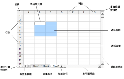 Spread控件是由与滚动条相结合共同来显示数据的表单组成。如果有多个表单,一个标签条里可以有多个标签。 下面的图片显示了Spread控件的主体部分。其中的多个部分可以被隐藏,但这里展示了默认的显示。