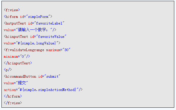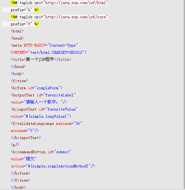 在声明后是几行标准的HTML语句,本文不再详述。从 f:view 开始,是一段JSF语句。这段代码如下所示: