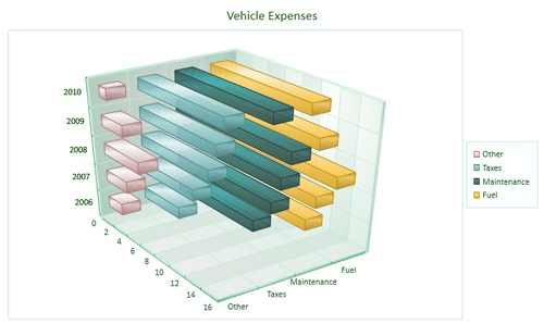 * Bar in 3D:"Manhattan"(见截图), regular(clustered), stacked, ranged and 100% stacked(见截图).