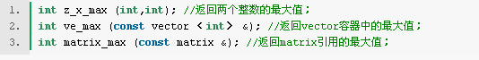 上面的三个函数都可以大概地说成判断一组数中的最大值,对于函数的用户来说,他们并不关心函数定义的细节,也就是说他们不关心判断两个整数的大小和判断数组(vector容器)数的大小应该使用不同的函数,而对于程序的设计者来说这可是不得不想到的。程序员必须记住并查找每个函数名。而函数的重载把程序员从这种问题的复杂性中解放了出来,C++提供了这种支持。上面的三个比较大小的函数可以定义成: