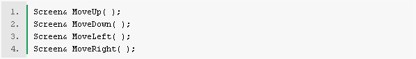 看过这四个函数不言而喻,它们是控制光标在屏幕上的位置的,即:向上移动光标,向下移动光标,向左移动光标,向右移动光标。如果我现在把它们写成重载函数,每个都是Screen& Move( );显然对于程序员来说是不易理解的。因此对于函数重载的使用我们应遵循应用的逻辑,而不是简单地因为它的存在就必须使用它。程序员不应该勉强使用重载函数。