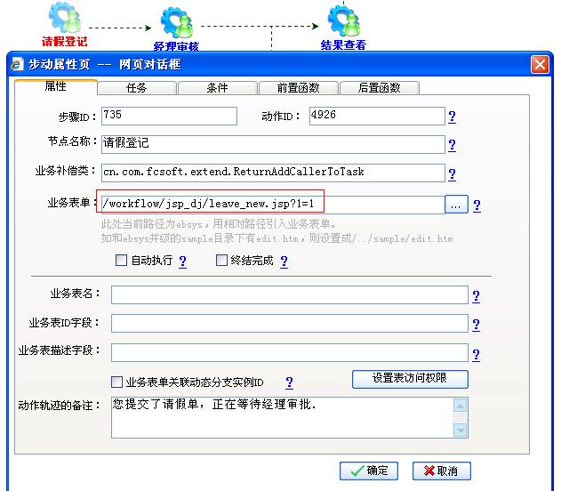 这样,就完成了一个流程节点的办理,既提交了业务数据,又执行了流程的流转。