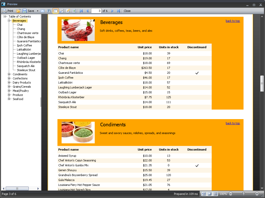 提供预览窗口中的导航。当您在设计报表时,您可以用其定义报表元素来形成一个报表大纲,这个大纲会展示在预览窗口中。当您点击一个大纲项目,预览窗口会自动滚动到该指定的项目。您也可以定义一个活动项目来接受鼠标点击的指令,它可以完成导航至另外的报表元素或者外部URL。