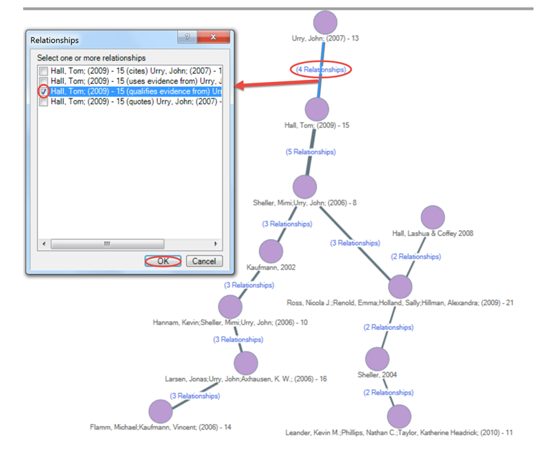 从下面的Network Sociogram中可以看出,Hall(2009)和Urry(2007)之间有四种关系,当我双击该线时,弹框会打开,向我展示这四种关系是什么。如果我选择任意一个并点击确定,带有详细信息的参考文章将在视图中打开,如下图所示:
