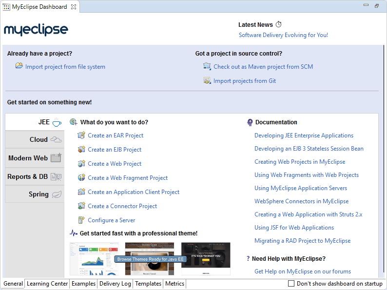 MyEclipse Dashboard视图使您可以快速开始新项目。您可以找到指向新项目向导、项目导入、源代码控制中的项目和相关帮助主题的快速链接。单击与要创建的项目类型对应的标签,以查找与该项目类型相关的链接。