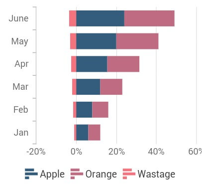 堆积条形图类似于堆积柱形图。与堆积柱形图不同的是,它允许您在水平柱状图的顶部绘制数据点。以下代码说明了如何渲染堆积条形图: