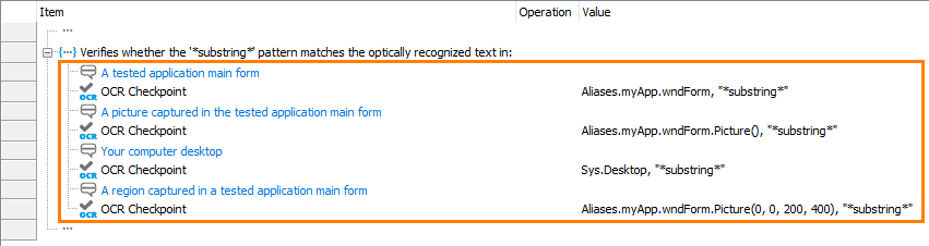 // Verifies whether the '*substring*' pattern matches the optically recognized text in: // A tested application main form OCR["Recognize"](Aliases["myApp"]["wndForm"])["CheckText"]("*substring*"); // A picture captured in the tested application main form OCR["Recognize"](Aliases["myApp"]["wndForm"]["Picture"]())["CheckText"]("*substring*"); // Your computer desktop OCR["Recognize"](Sys["Desktop"])["CheckText"]("*substring*"); // A region captured in a tested application main form OCR["Recognize"](Aliases["myApp"]["wndForm"]["Picture"](0, 0, 200, 400))["CheckText"]("*substring*");
