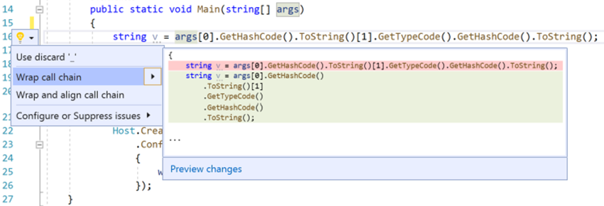 您可以使用重构包装流畅的调用链。要尝试此操作,请将光标放在呼叫链上,然后按Ctrl+,打开“快速操作和重构”菜单。