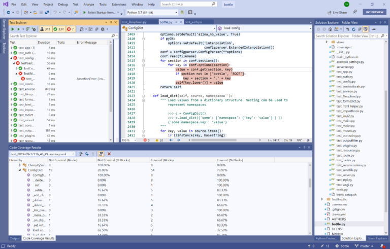 要为当前打开的项目/文件夹启用Code Coverage,必须将Python程序包coverage安装到活动的虚拟环境中。然后,您可以通过转到“测试资源管理器”并选择“ 分析所有测试的代码覆盖率”来分析代码覆盖率。