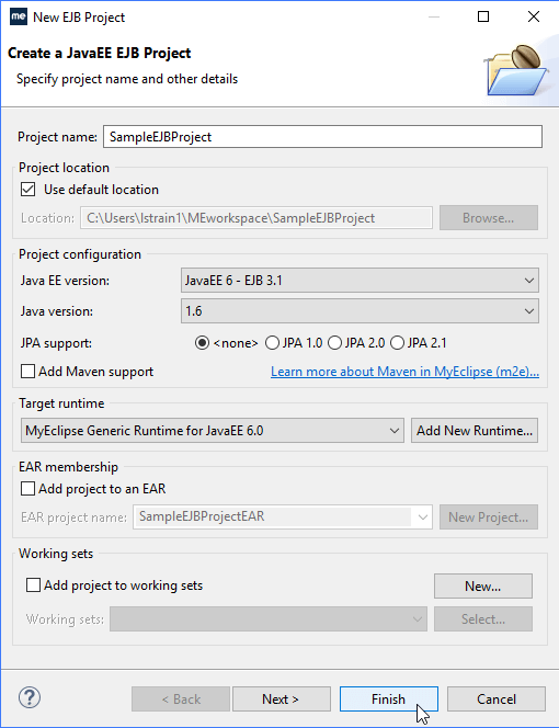 选择JavaEE 6-EJB 3.1作为JavaEE版本,选择None作为JPA支持,然后单击Finish。向导中的其余字段由 Window>Preferences>Frameworks>EJB Project 设置的MyEclipse EJB项目模板填充。