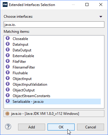 单击添加,输入java.io。在“Choose interfaces”字段中,选择“Serializable”,然后单击“OK”。这扩展了可序列化,因此应用服务器可以根据需要更好地处理Session Bean。