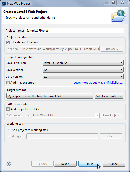 在“Project name”字段中键入SampleJSFProject,接受默认值,然后单击“Finish”。注意:本教程使用JavaEE 5版本。但是,在创建新项目时,可以使用JavaEE 6或7。