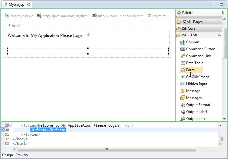 在选用板中展开JSF HTML,然后将“Form”拖动到文本下方的页面上。