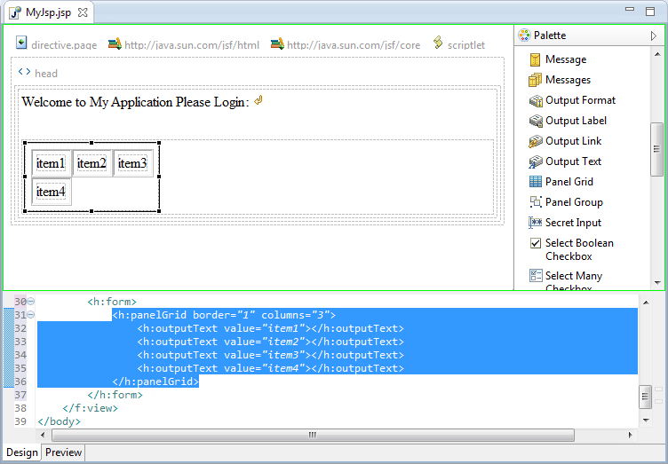 从“Template”中选择要使用的默认JSF模板,然后单击Finish。该页面会自动打开,并且在面板中提供带有JSF控件的JSP设计器。