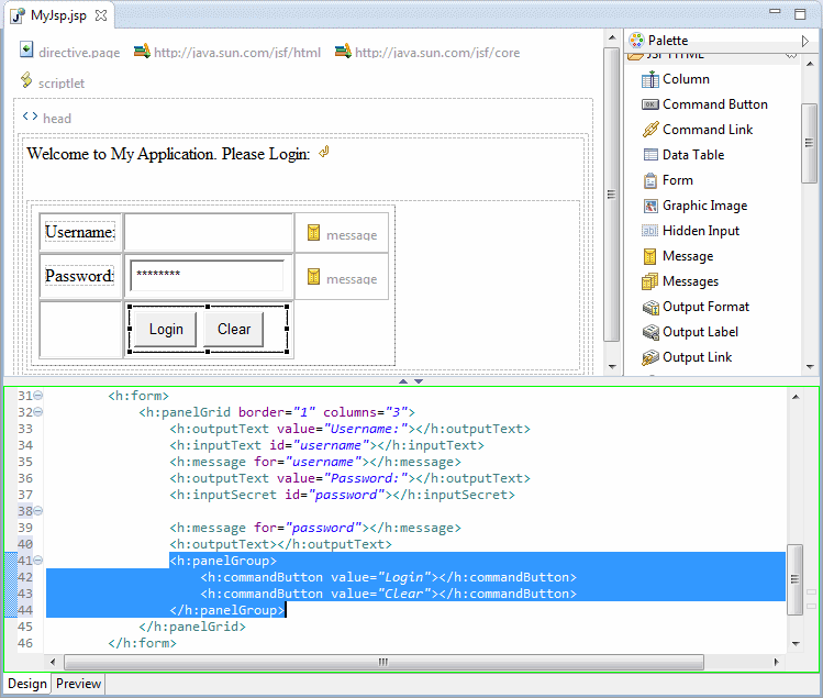 页面的设计部分已经完成。通过以上内容,您应该了解了Designer的工作原理。如果您要构建完整的JSF应用程序,则需要为按钮分配操作处理程序,并将值绑定到输入字段,以确保托管bean正确地支持此页面上的值。