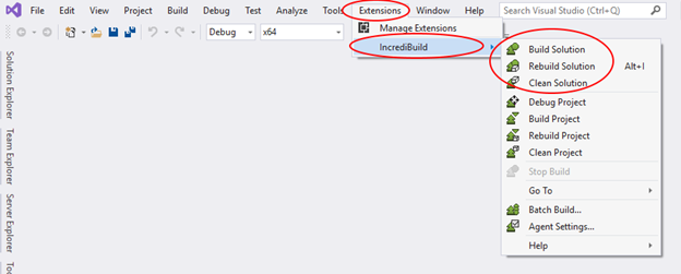 要使用IncrediBuild启动构建,只需导航至“Extension”菜单,然后选择一个构建选项(Build Solution、Rebuild Solution、Clean Solution)。如果已经通过IncrediBuild启动了构建,并且想在Build Monitor上查看当前构建,只需导航至“View”菜单,然后选择“IncrediBuild Monitor”。