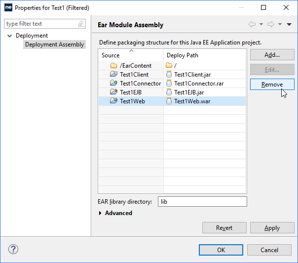 注意:添加或删除模块项目的过程会更改EAR项目的部署形式的物理形状。如果您的EAR项目已部署,请在添加或删除模块项目之前取消部署。在工具栏上使用或右键单击项目,并选择Java EE Tools > Add and Remove Project Deployments 。