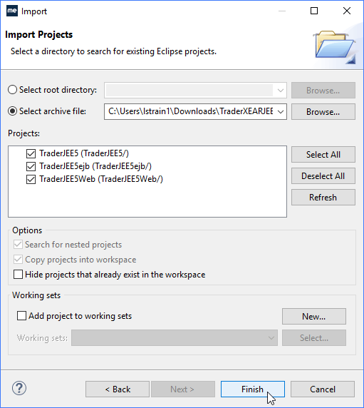 单击Select archive file选项,浏览示例zip文件,然后单击Finish。