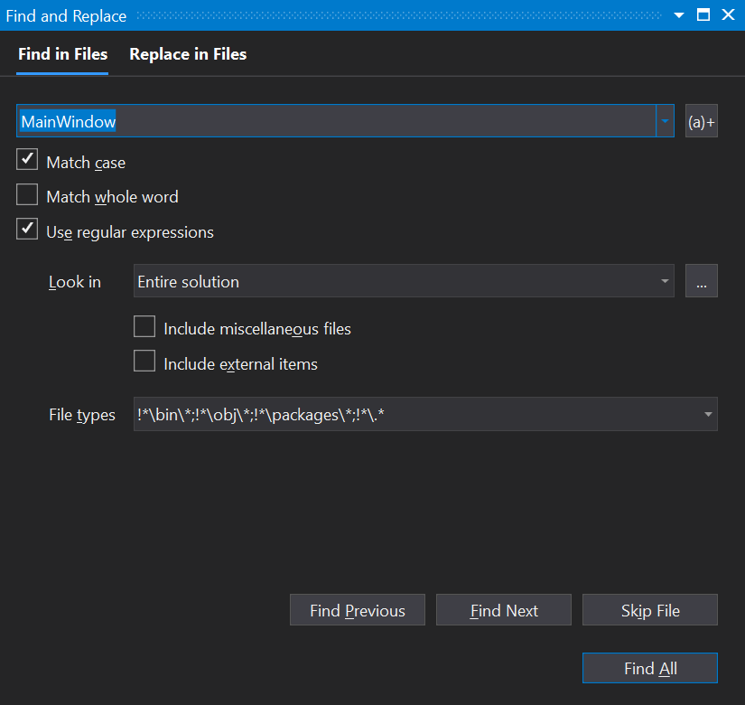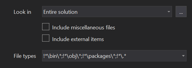 “Look in”框有一个新选项“Current Directory”,它将搜索包含当前打开的文档的文件夹。搜索解决方案时,有复选框包含杂项文件(已打开但不属于解决方案的文件)以及外部项(如“windows”文件,你可以参考但不是解决方案的一部分)。