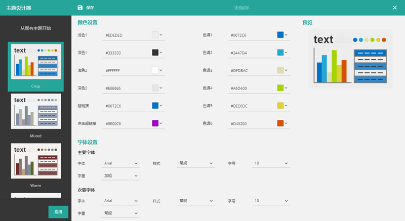 通过主题设计器,可以创建自定义的主题样式,并应用到您的仪表板和报表中,以此满足您企业独有的样式需要。同时,主题文件也能共享给其他用户使用。