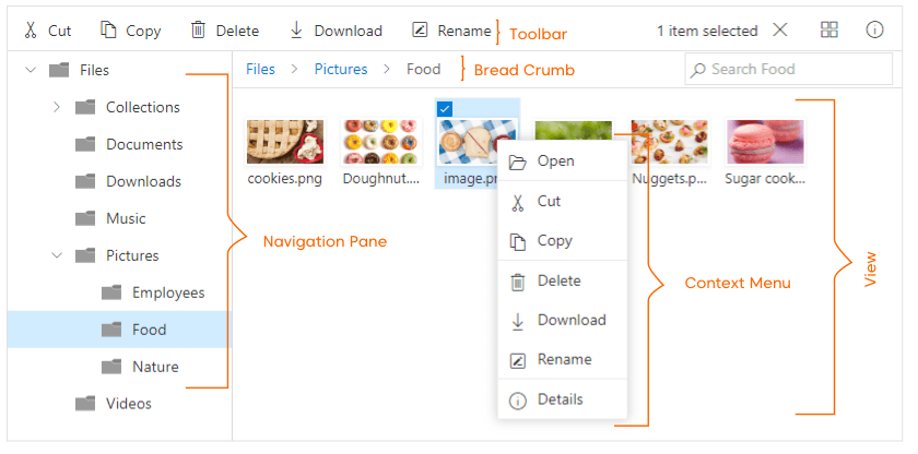 文件管理器控件的功能使用80/20规则实现。这将涵盖有效管理Web浏览器中的文件系统的主要业务需求。以下是文件管理器中可用的功能: