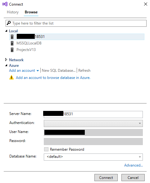 步骤3:在这里,我们可以选择从本地计算机的SQL Server(通过网络连接)和Azure SQL数据库中进行选择。本文选择了本地SQL Server实例。在提供了SQL Server详细信息后,单击“连接”,SQL Server将在资源管理器中列出。