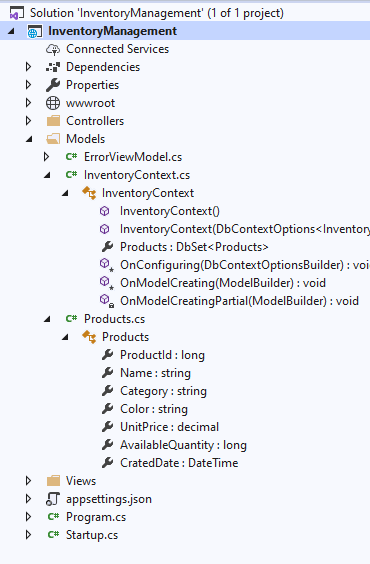 然后我们可以在应用程序启动期间注册数据库上下文服务(InventotyContext)。在以下代码中,从appsettings文件中读取连接字符串并将其传递给上下文服务。