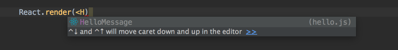 IntelliJ IDEA 使用JavaScript代码为React API和JSX提供代码完成。代码完成适用于React方法,React特定的属性,HTML标记和组件名称, React事件,组件属性等。