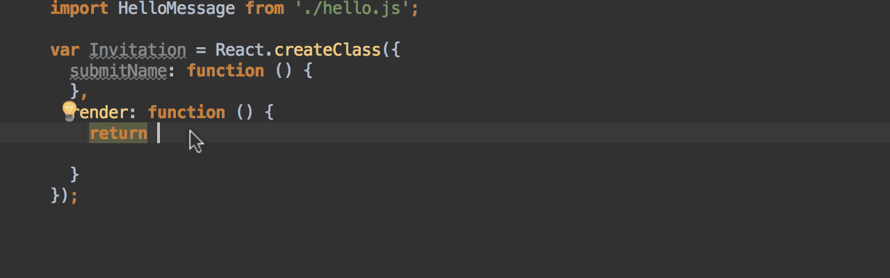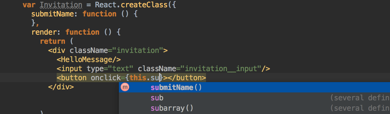IntelliJ IDEA为您在JavaScript的方法或其他组件内部定义的HTML标记和组件名称提供代码完成: