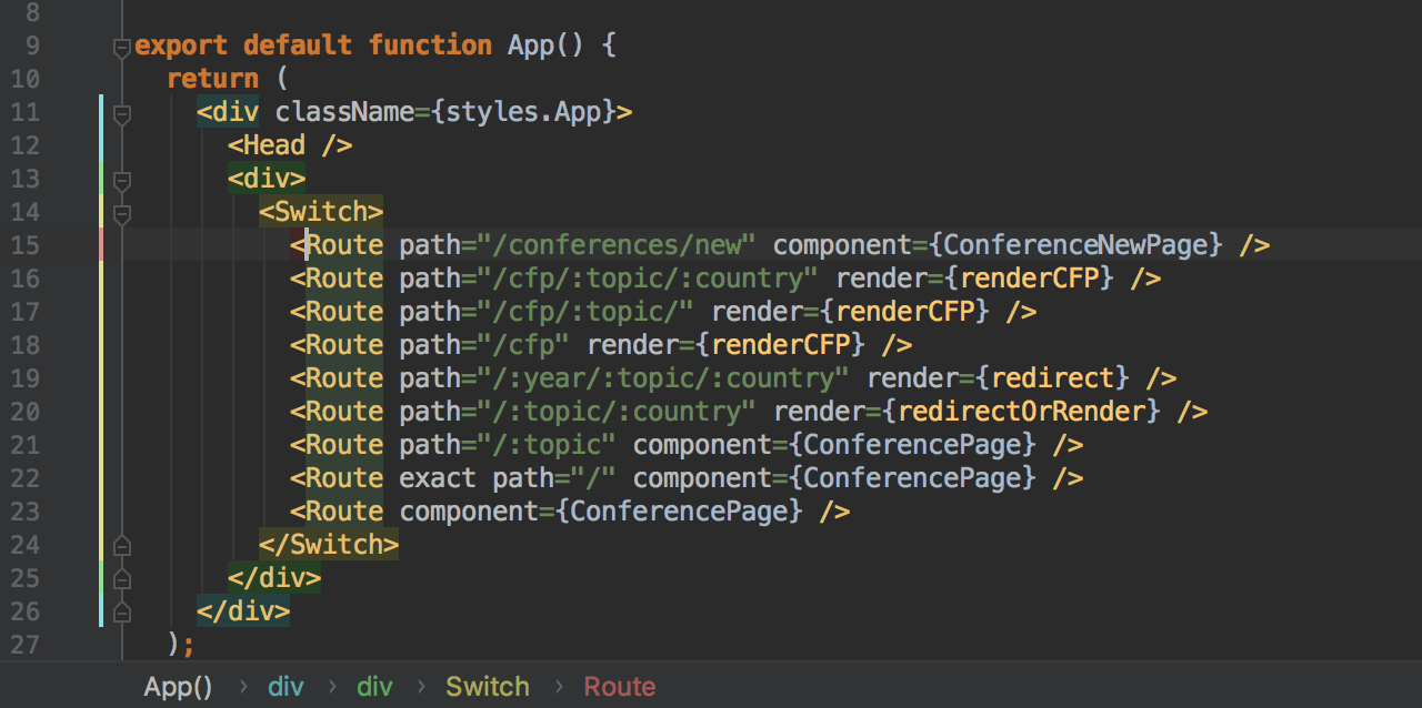 IntelliJ IDEA使您可以使用面包屑和在编辑器装订线中标记树的彩色突出显示轻松浏览JSX标记: