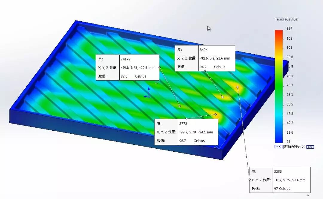 随后我们对功耗进行了调整,将热功率提升到2KW,可以获得下面的云图。结果也非常明确的显示出来,整体的工作面温度在95度左右。对于这样的结果虽然还是差强人意,但是对比前一个分析算例还是改进很多的。