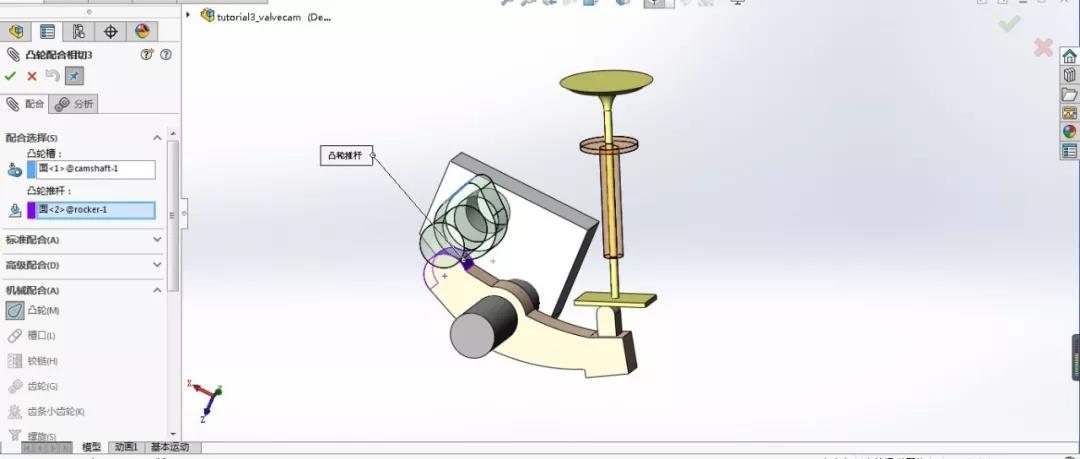 SolidWork装配体配合包括标准配合、高级配合和机械配合,前几期和大家分享了高级配合,这些配合关系可以大大提高装配效率,但是对于一些机械专用的配合方式,可能就不能满足要求,所以从本期开始和大家探讨一下机械配合方式,本期先谈谈:凸轮配合。