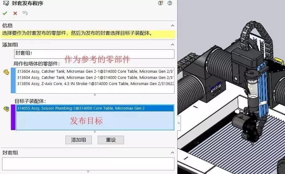 利用这个方法,可以把Top-Down设计中顶层的设计意图,如已有装配体,模型空间等。通过封套发布程序工具,把设计数据传递到子装配体中。零部件比常用的草图、基准面、参数等等包含更多的信息,更有利于传递设计意图。