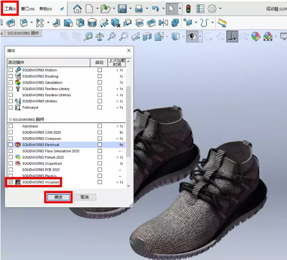 3.菜单栏-工具-插件-勾选SolidWorks Visualize-确定