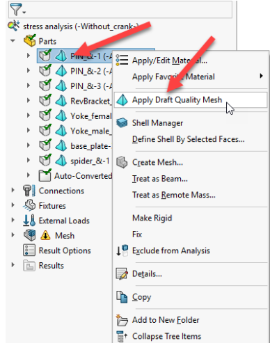 您可以通过右键单击算例树中的一个或多个实体,然后单击“ 应用草图质量网格” 或“ 应用高质量网格” (取决于其当前状态),在元素类型之间切换。您也可以右键单击顶层“零件”文件夹,然后将元素类型应用于所有实体。