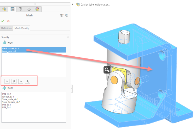 定义为吃水质量元素的实体显示带有直边的四面体元素图标。定义为“高质量”元素的实体显示带有弯曲边缘的四面体元素图标。在下面的屏幕截图中,橙色箭头显示“草稿”,蓝色箭头显示“高”。
