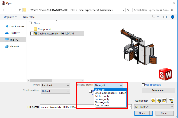 该选项仅加载在选定显示状态下可见的那些装配体零部件。由于需要在计算机内存中加载较少的组件,因此可以带来很大的性能提升。