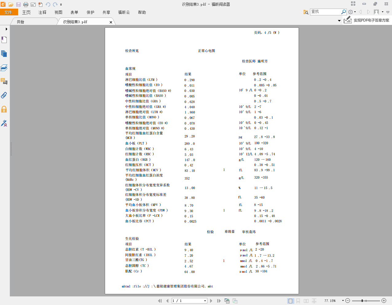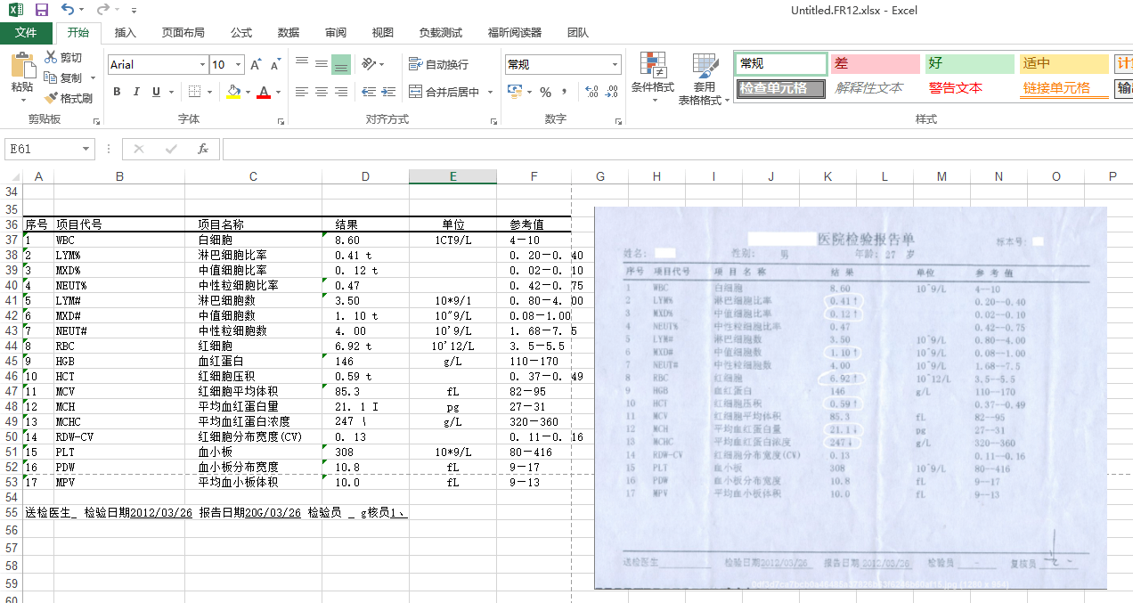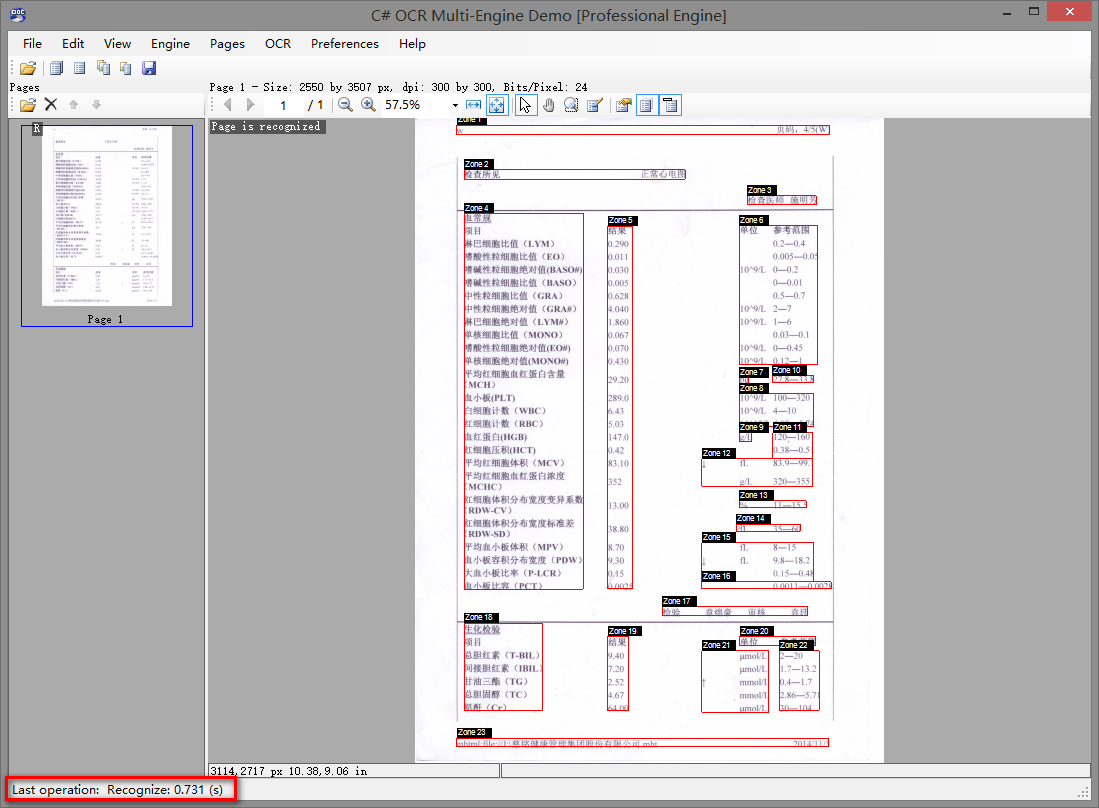 飞一般的识别速度带来非同一般的识别结果,超快速的识别速度下仍然提供高达98%的识别精度。如下图,只需要0.731秒就可以完全识别一张a4体检报告表。