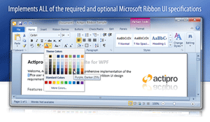 pro Ribbon is a control suite that implements an Office 2007-like user interface for the Windows Presentation Foundation (WPF). It meets 100% of the required and optional Microsoft licensing requirements for implementation of a ribbon user interface, and is the most feature-rich WPF ribbon available today.